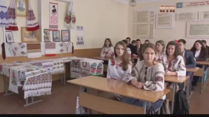 Щойно переступаєш поріг навчального закладу – привітно й барвисто гостей зустрічають вишивані образи козаків та козачок, на іншій стіні – вишитий хрестиком український Гімн. У національному одязі сьогодні до школи прийшли усі: учні, учителі, і навіть чергові на посту вітають відвідувачів теж у вишиванках.