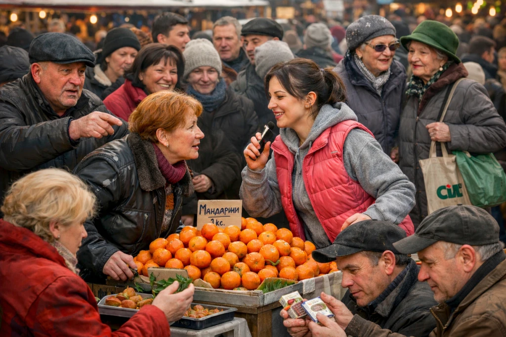 Люди штовхаються, стовбичать один над одним. Гарні мандарини, аж воскові! І пахнуть! Старша жінка в шкіряній куртці, яка була модна в першій половині 90-х, випитує у продавчині:
