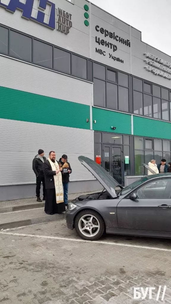 У Нововолинську, біля сервісного центру МВС, священник окропив свяченою водою автівки. Про це повідомили БУГу читачі й надіслали фото.