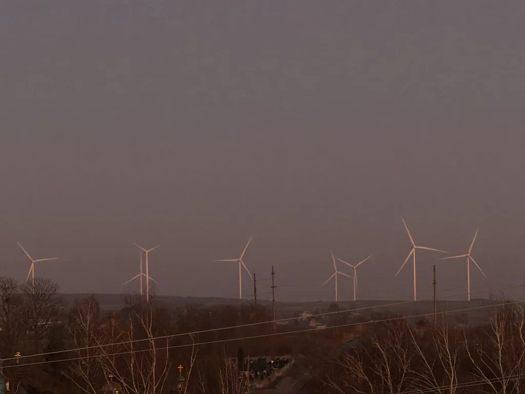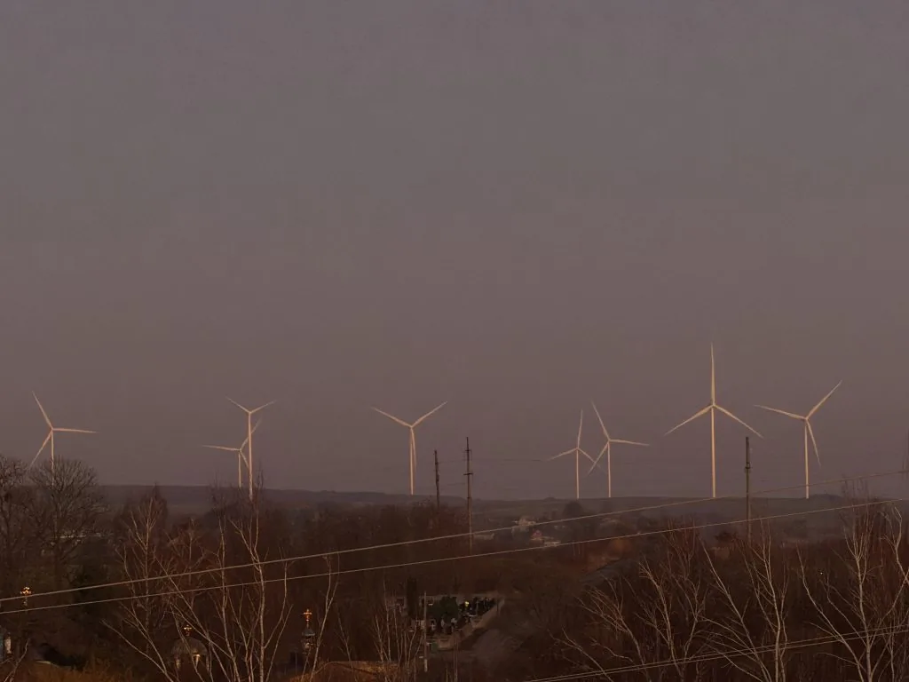 15-го грудня на околицях Нововолинська можна побачити, як більшість вітрових турбін уже працюють — вітроколеса обертаються на тлі зимового заходу сонця.