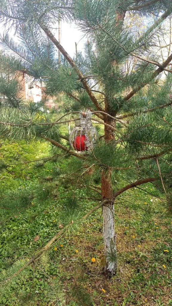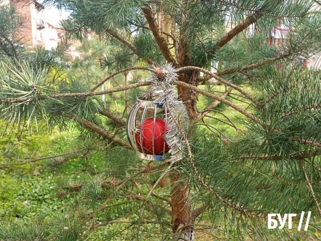 В одному з дворів у центрі міста, серед зеленої трави та квітучих дерев, на вулиці висить новорічна прикраса.