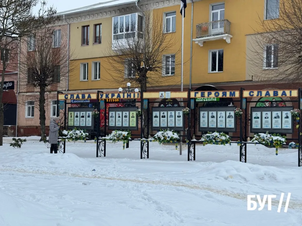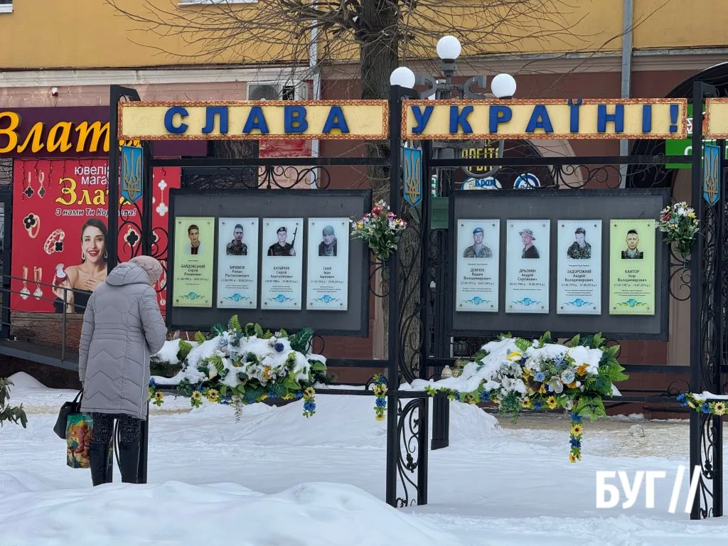 На світлині — жінка біля стенду з портретами полеглих. Вона зупинилася, щоб згадати. У зимовій тиші, серед снігу, пам’ять звучить голосніше за слова.
