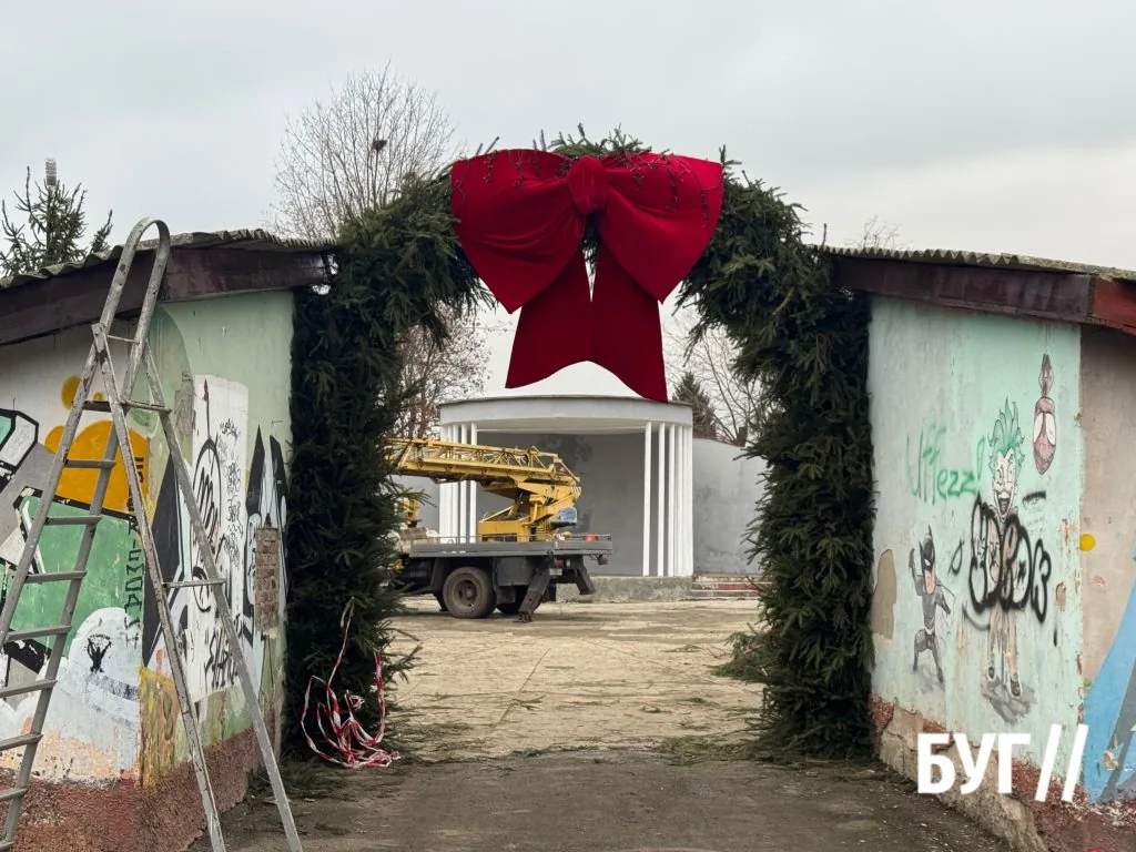 Фахівці ВУКГ оформлюють аркові конструкції з ялинових гілок, встановлюють великі декоративні банти та монтують тематичні елементи. На локації завершують облаштування Будиночка святого Миколая, фарбують окремі ділянки та впорядковують територію.