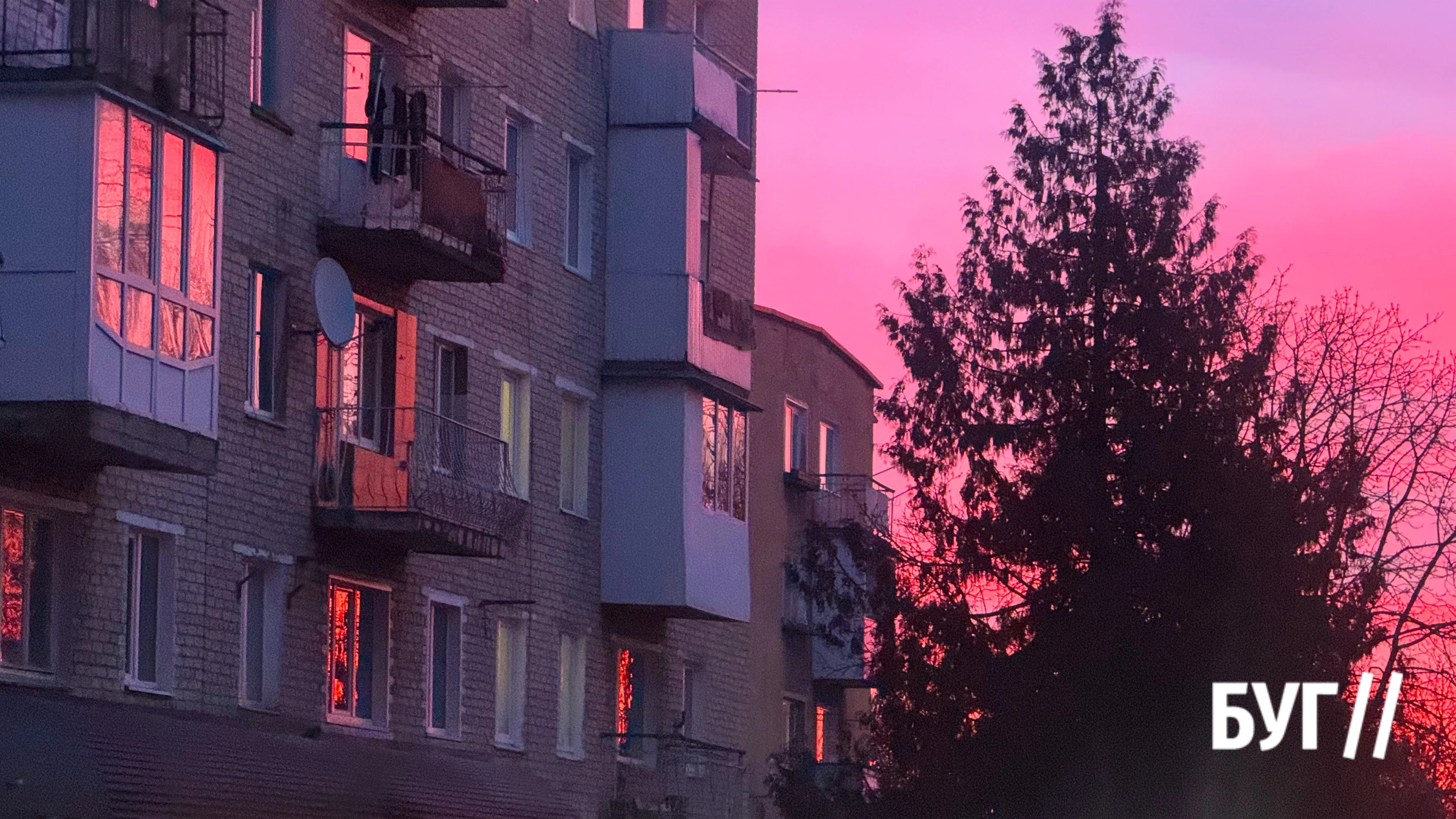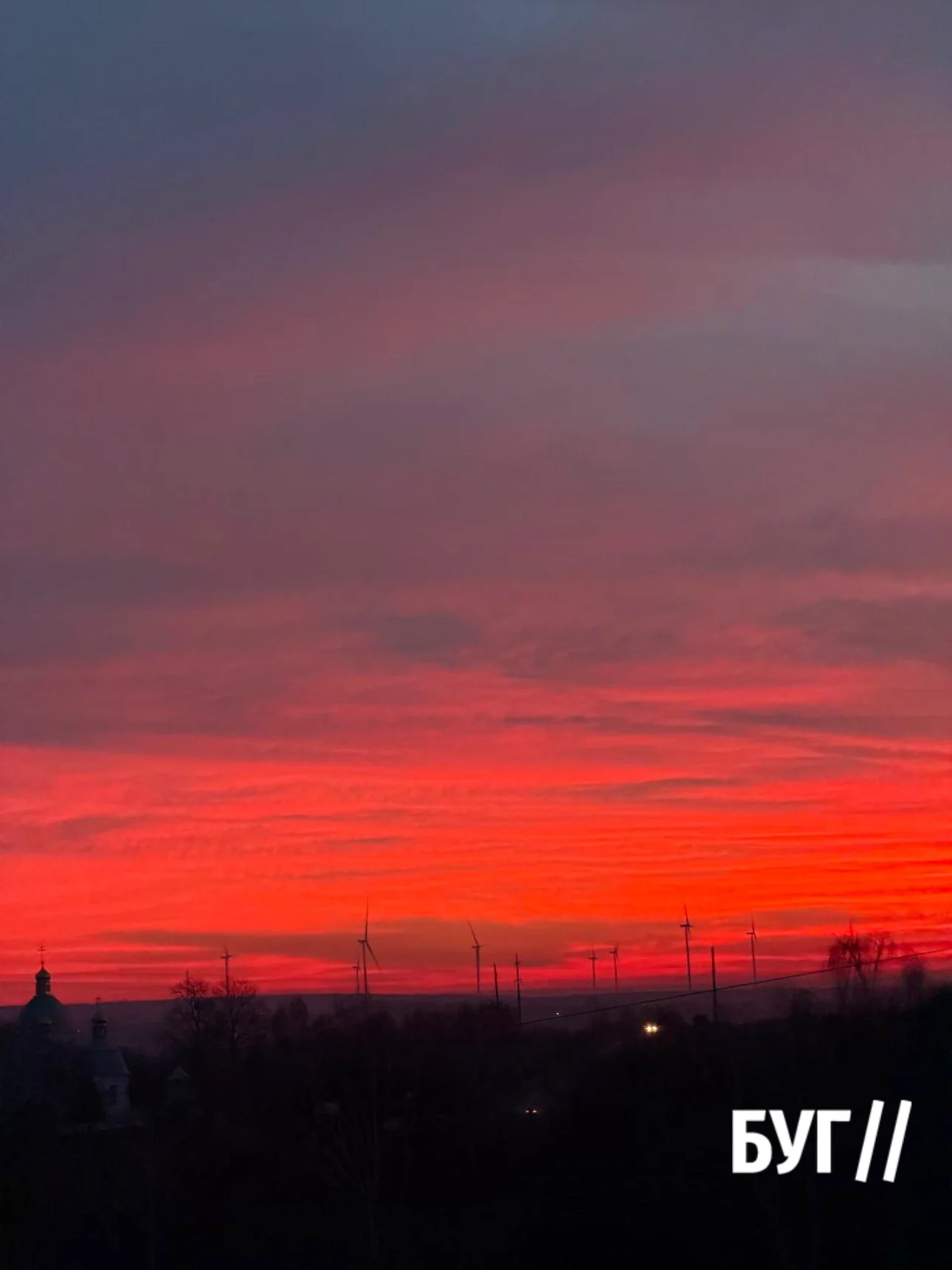 Небо над містом загорілося глибокими червоними відтінками, дерева стали темними силуетами, а вулиці ще тримають у собі нічну тишу. Це той час, коли день лише збирається з думками.