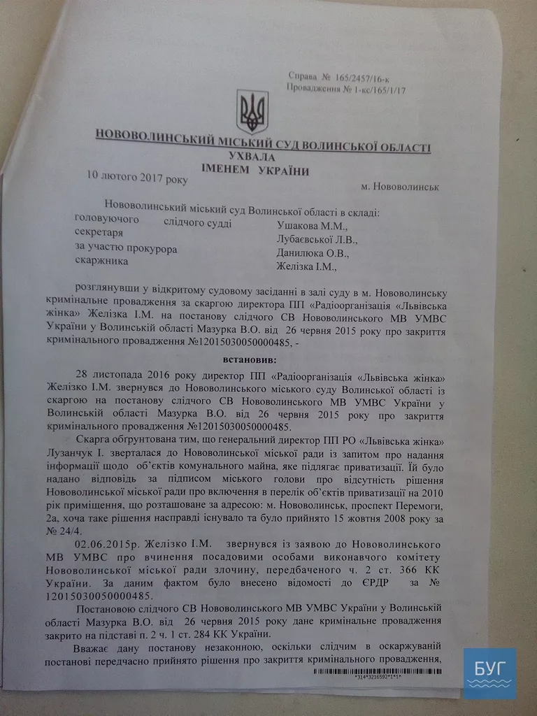 Суд скасував постанову слідчого Нововолинського відділку поліції Мазурка щодо закриття кримінального провадження про вчинення посадовими особами виконкому Нововолинської міської ради службового підроблення документів та задовольнив скаргу директора ПП “Радіоорганізація “Львівська жінка” Ігоря Желізка.