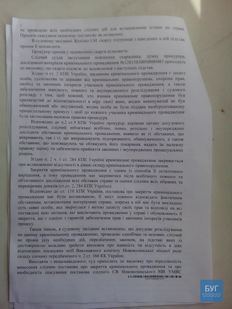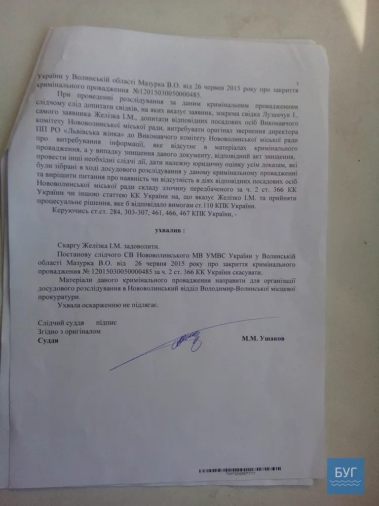 Суддя Ушаков своїм рішенням зобов’язав слідчого опитати свідків, посадових осіб виконкому Нововолинської міськради та надати юридичну оцінку всіх доказів, отриманих в ході досудового розслідування.