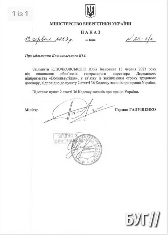 Відповідний наказ №26-к/к про звільнення Юрія Ключковського з посади генерального директора ДП «Волиньвугілля» видав міністр енергетики Герман Галущенко 13-го червня.