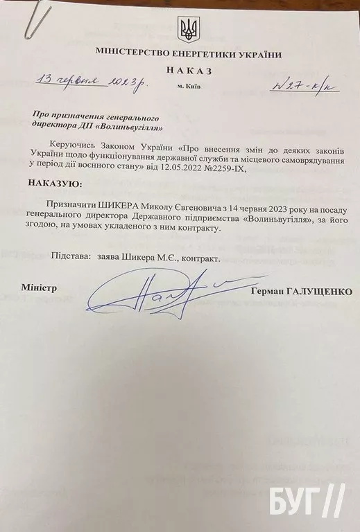 Водночас міністр видав другий наказ від 13-го червня №27-к/к, яким знову призначив на дану посаду Миколу Шикера. Він обіймав посаду гендиректора ДП “Волиньвугілля” із 29-го липня 2022 року, поки Юрій Крючковський перебував на службі у ЗСУ.