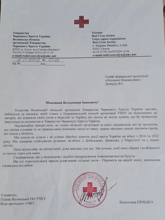 Колектив Волинської організації Товариство Червоного Хреста України попросив вибачення у матерів загиблих військових в АТО/ООС нововолинців, яких образили їхні працівники.
