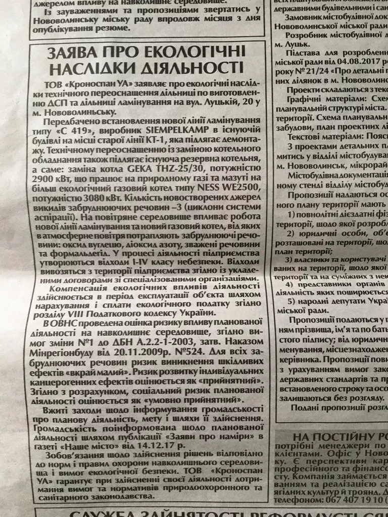 На ТОВ «Кроноспан УА» у Нововолинську триває процес технічного переоснащення. На повітряне середовище впливає робота нової лінії ламінування та новий газовий котел, від яких в атмосферне повітря потрапляють забруднюючі речовини. 23-го лютого в газеті «Наше місто» опублікували заяву про екологічні наслідки діяльності.