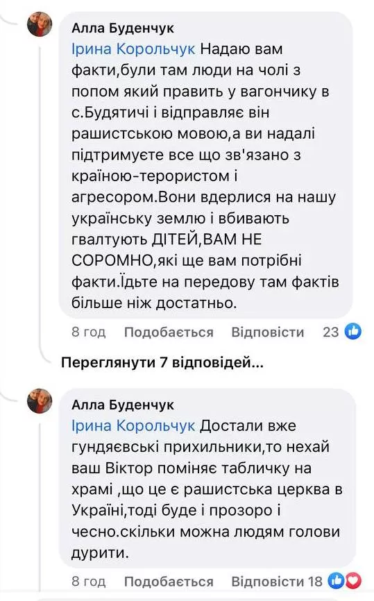 15.02.2023 о 20:09” В церкві московського патріархату немає бога. Не прикривайтеся богом! Де в росії є хоча б одна Українська церква? В нас іде війна з 2014р., а московські попи ще досі в Україні проводять пропаганду7 Це давно треба заборонити! Голими руками пора повикидати московитів на росію. Ганьба прихильникам мп.
