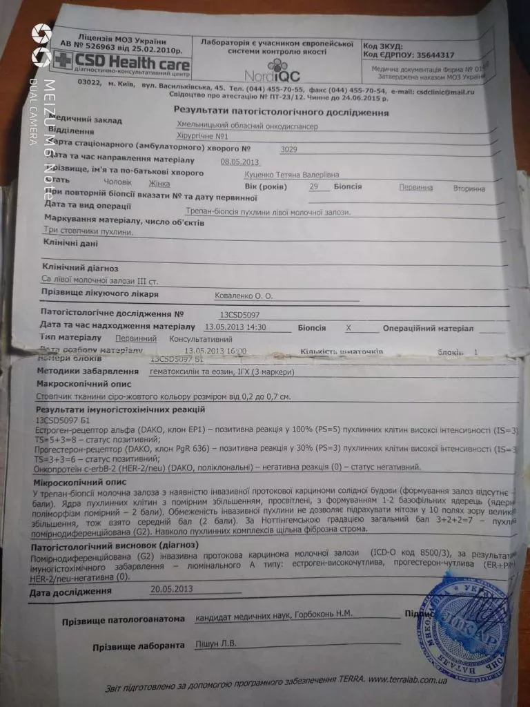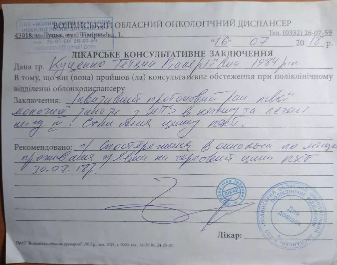 Діагноз рак лівої молочної залози 3-ї стадії жінці поставили в 2013 році. Тоді вона перенесла дві операції, 7 хімій та 20 променевих терапій. Лікування тривало протягом року. Наступні чотири Тетяна жила на гормональних препаратах в надії більше не побачити недугу.