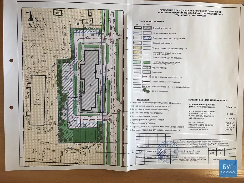 Основні техніко-економічні показники проекту: передбачається будівництво багатоквартирного житлового будинку з вбудованими приміщеннями медичного центру на вулиці Стуса, 2а, на земельній ділянці площею 0,3690 га, площа забудови – 760,0 кв.м, площа замощення – 1325,0 кв.м, площа озеленення – 1605,0 кв.м.