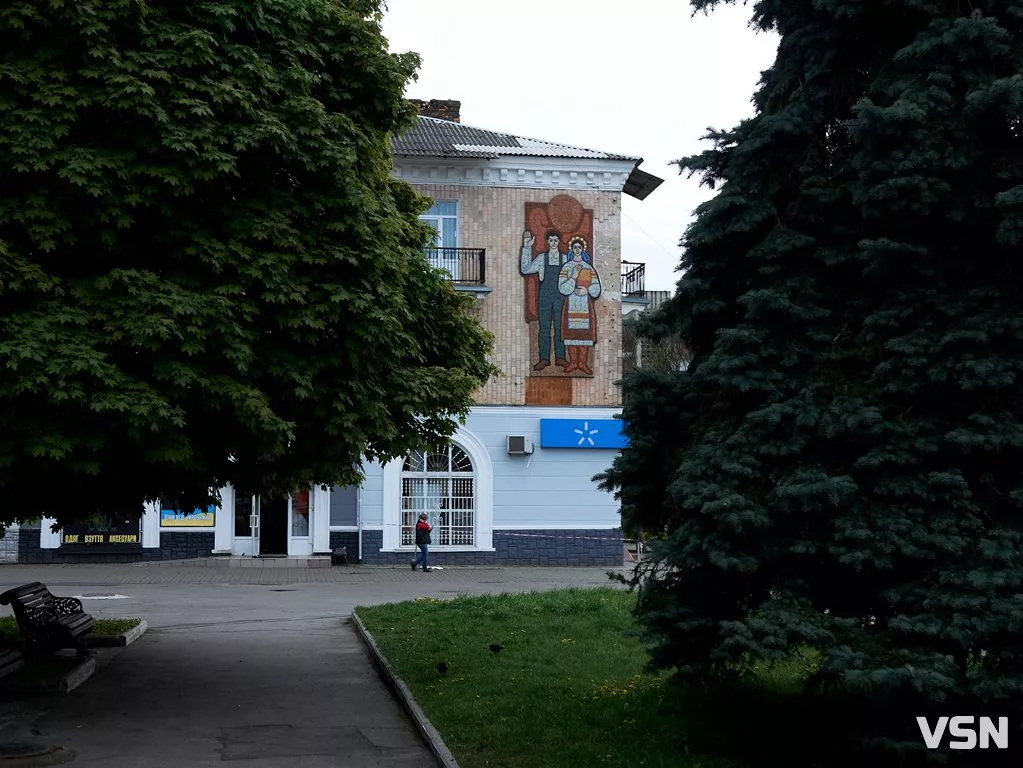 … «Для прикладу, є чотири мозаїки на центральній площі. На першій – інтернаціоналізм: українка, росіянка, грузинка, вірменка… З одного боку, це – елемент пропаганди, але символів комуністичних там нема. На другій – шахтар із відбійним молотком, вчитель з журналом і колгоспниця з колосками, вони уособлювали солідарність робітничого класу. Теж немає серпів, молотів, фраз якихось, тому її не чіпали. З протилежного боку – ще дві мозаїки на будівлях. На одній – чоловік та жінка, там же був герб СРСР, його замалювали. Ця історія про союз громадян СРСР, сім’ю як основу і так далі. Герб заретушували, я вважаю, що цього достатньо. Четверта – знамениті будьонівці, які стояли під червоним прапором, а коли відбулися перші процеси декомунізації, вирішили перефарбувати прапора з червоного у синьо-жовтий. Це – невдалий момент декомунізації. І смішно, і грішно, але саме ця мозаїка найбільше пропагує Радянський союз.