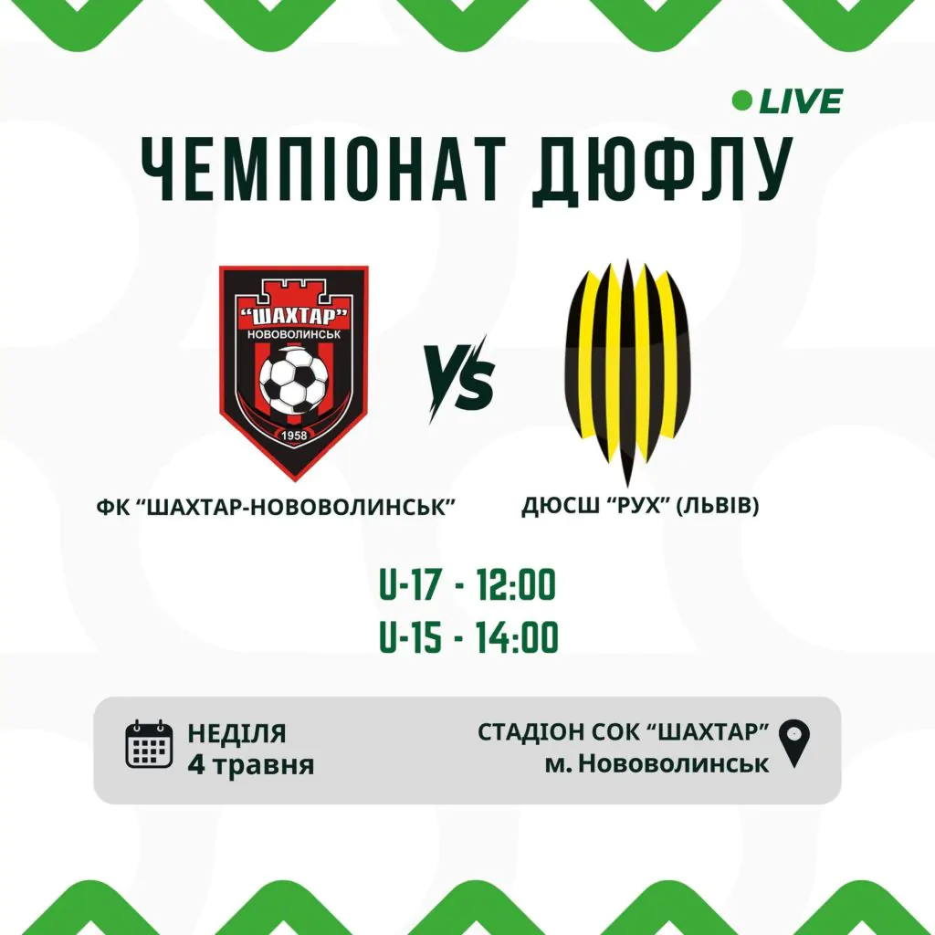 4-го травня ФК «Шахтар-Нововолинськ» зіграє вдома проти ДЮСШ «Рух» (Львів) у межах чемпіонату ДЮФЛУ.
