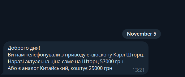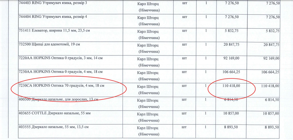 Варто також зазначити, що дешевших пропозицій найдорожчої позиції в закупівлі – нової портативної ендоскопічної відеосистеми «Tele Pack plus tp101» від виробника «Карл Шторц», який лікарня придбала майже за 700 тисяч гривень, знайти не вдалося.