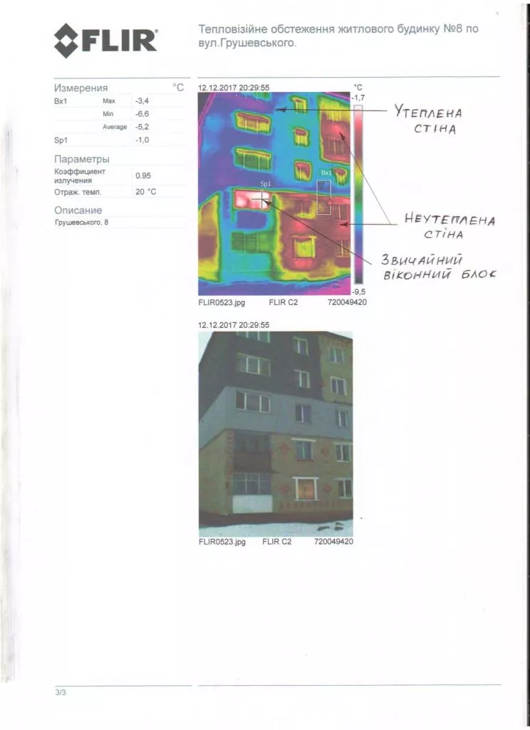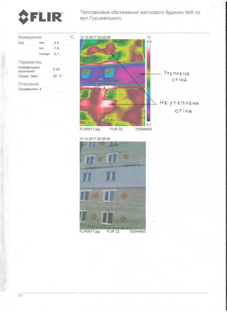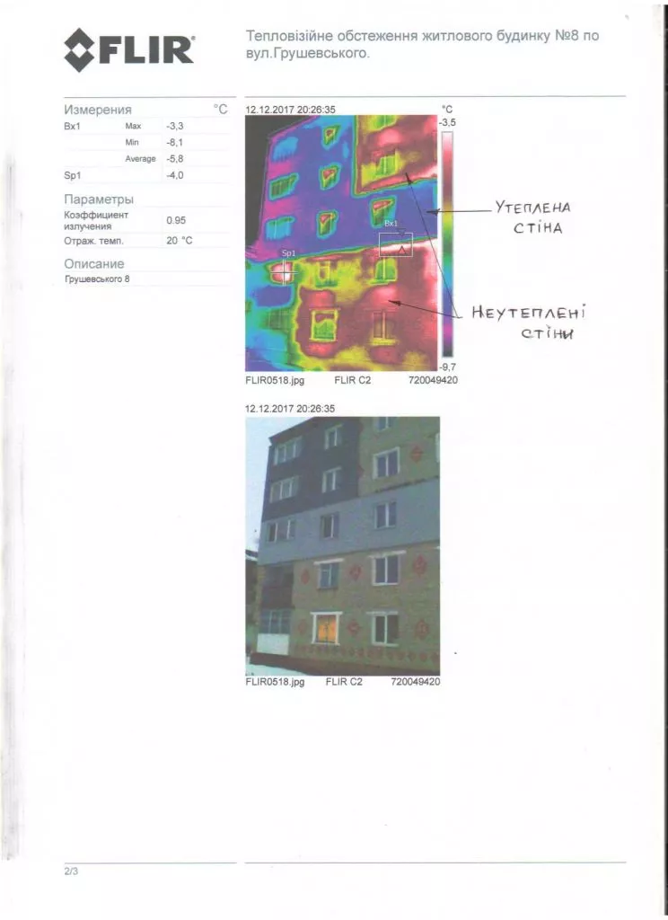 Прогулюючись вулицями міста можна побачити безліч будинків з ізоляцією зовнішніх стін мешканцями окремих квартир. Але така ізоляція окрім покращення комфорту перебування в квартирі нічого більше не дає. Тому така хаотична теплоізоляція зовнішніх стін в загальному на тариф впливу немає. І тільки при умові виконання комплексу робіт по утепленню зовнішніх стін та горища, заміні вікон на енергозберігаючі, заміні або ремонту вхідних дверей у під’їзд та встановлення шибок у підвальних та горищних віконцях дасть змогу мешканцям будинку економно споживати теплову енергію та й відповідно зменшити тарифи на тепло. Тепловтрати через зовнішні стіни можна побачити на тепловізійних світлинах внизу.