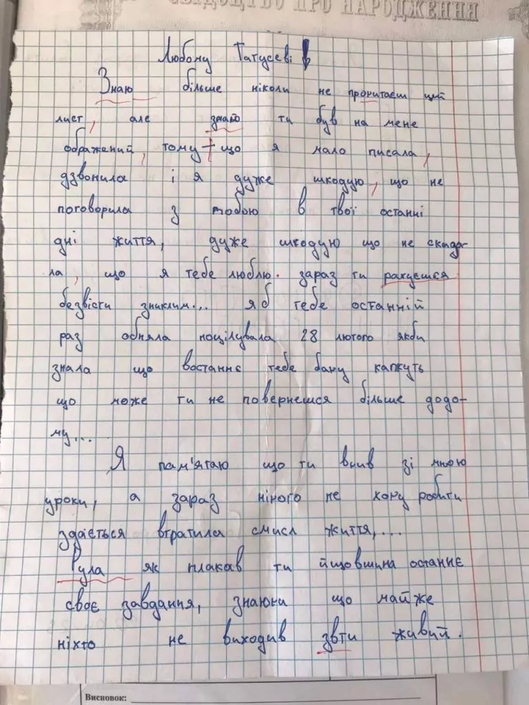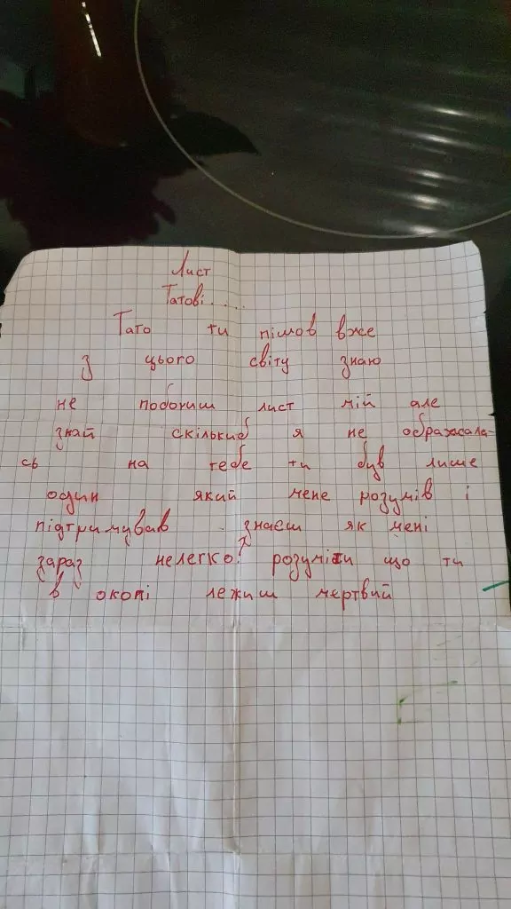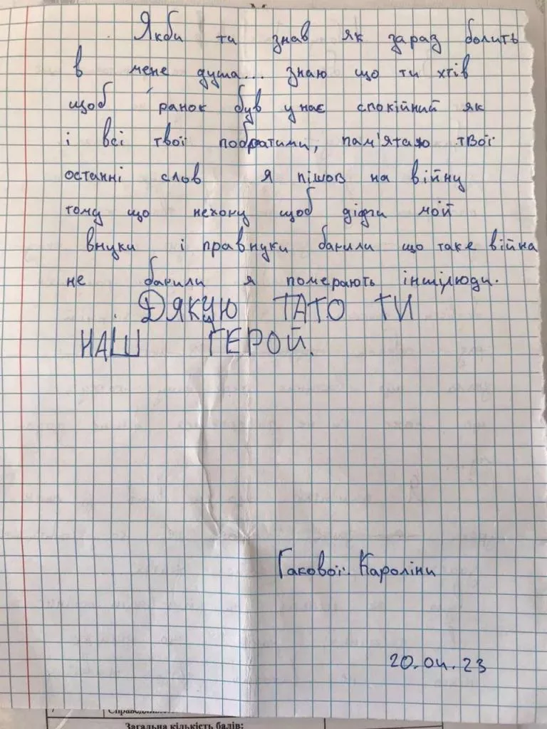 «Любий татусю! Ти пішов уже з цього світу і ніколи не прочитаєш мій лист. Ти був ображений на мене через те, що мало писала й дзвонила. І я дуже шкодую, що не поговорила з тобою в останні дні твого життя. Шкодую, що не розповіла, як я тебе люблю. Зараз ти вважаєшся безвісти зниклим. Я б обняла тебе, поцілувала якби 28 лютого знала, що бачу востаннє… Пам’ятаю, як ти вчив зі мною уроки, а зараз нічого не хочу робити. Здається, що втратила сенс життя. Чула, що ти плакав, ідучи на останнє своє завдання, знаючи, що майже ніхто не виходить звідти живим. Якби ти знав як зараз болить у мене душа…Знаю, що ти, як і всі твої побратими, хотів, щоб у нас був спокійний ранок. Пам’ятаю останні твої слова: «Я йду на фронт, аби діти мої, внуки і правнуки не знали, що таке війна, не бачили, як помирають люди. ДЯКУЮ , ТАТО.ТИ – НАШ ГЕРОЙ!