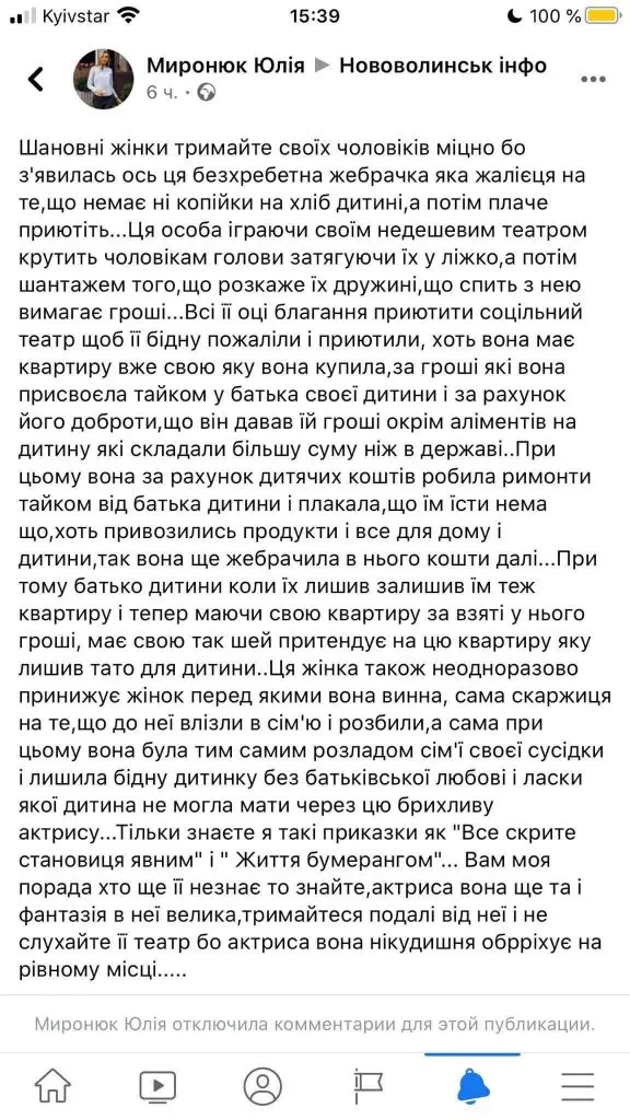 Співмешканка чоловіка опублікувала пост у фейсбуці, який за словами Марійки, і став “останньою краплею”… Після того, як почали привселюдно порочити її честь та гідність, вона вирішила також не мовчати. Публікація була від фейкової сторінки.