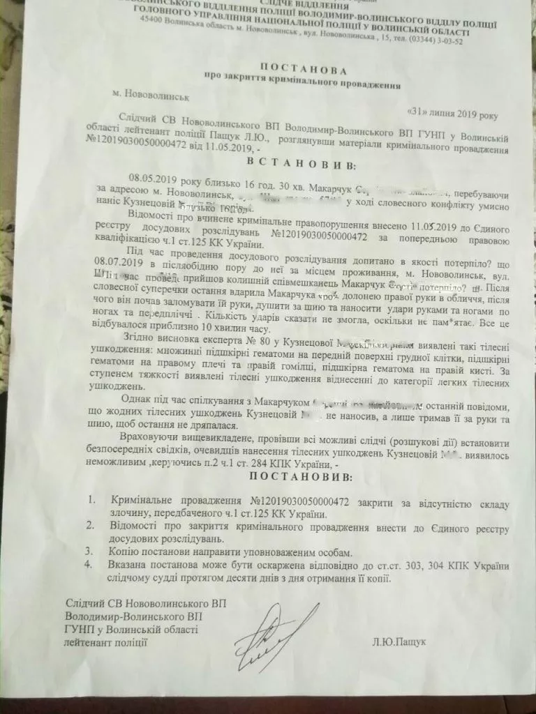 Водій, який привіз мене, і дитина сиділи в машині і боялися вийти. Він, між іншим, потім знайшов того чоловіка і залякав його, щоб той мовчав. Потім я почала забирати дитину в його співмешканки. Вона не віддавала, ну я дала їй ляпас. От за це і заявили в поліцію. На виклик приїхали Іваничівські поліцейські. Відкрили на мене справу за насильство, купили довідку в невролога в Нововолинську: записали їй струс, втрату свідомомтсі, поламаний ніс, хоча судмедексперт не підтвердив. Свідком події був той самий Макарчук, який побив мене перед тим 20 хвилин тому”.
