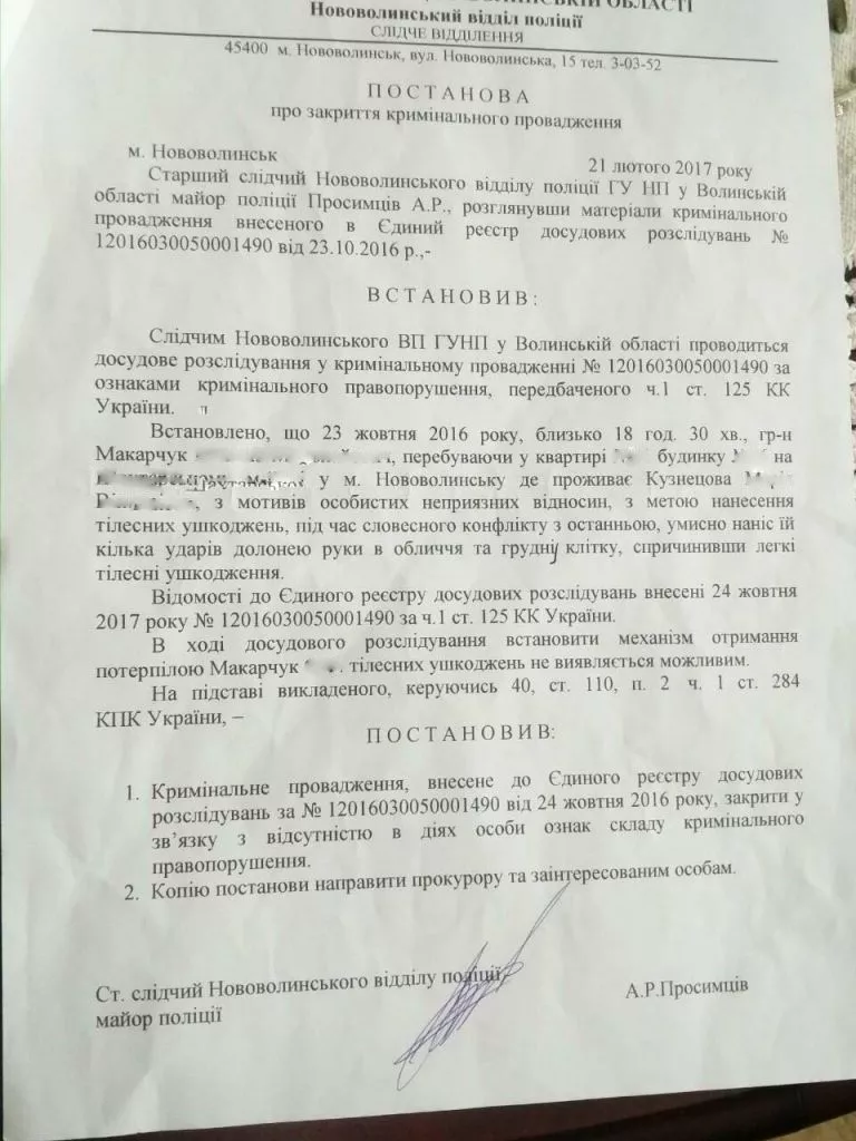 Жінка додає, що Макарчук всіх залякує, купує поліцейських та розповідає по місту про неї плітки. Її остання надія – це допомога соціальних служб та розголос цієї ситуації. За фактом останнього побиття, 1-го березня, каже жінка, зняла побої в Нововолинській лікарні.