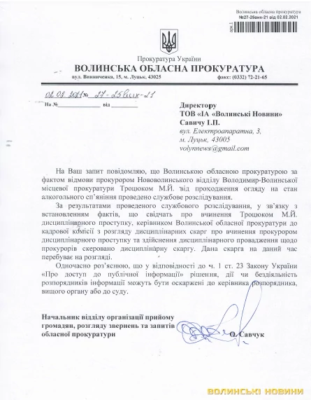 Волинські Новини надіслали інформаційний запит керівнику Волинської обласної прокуратури Віктору Тимчику, аби дізнатися, чи проводиться службове розслідування та на якому воно етапі.