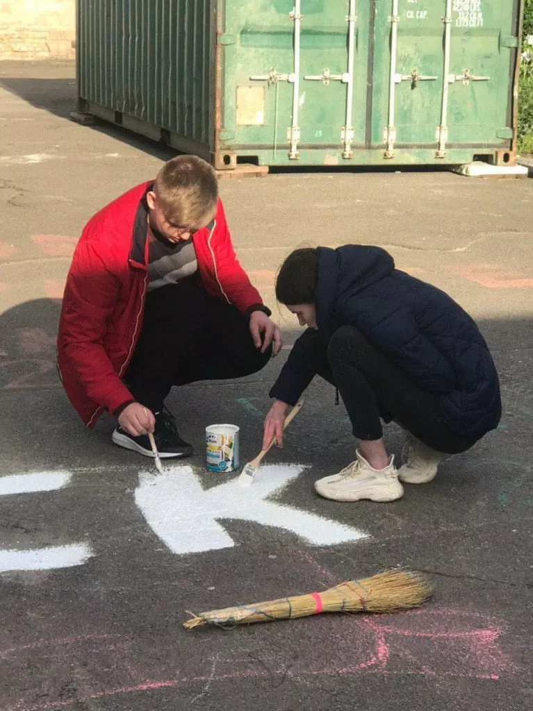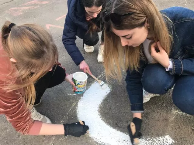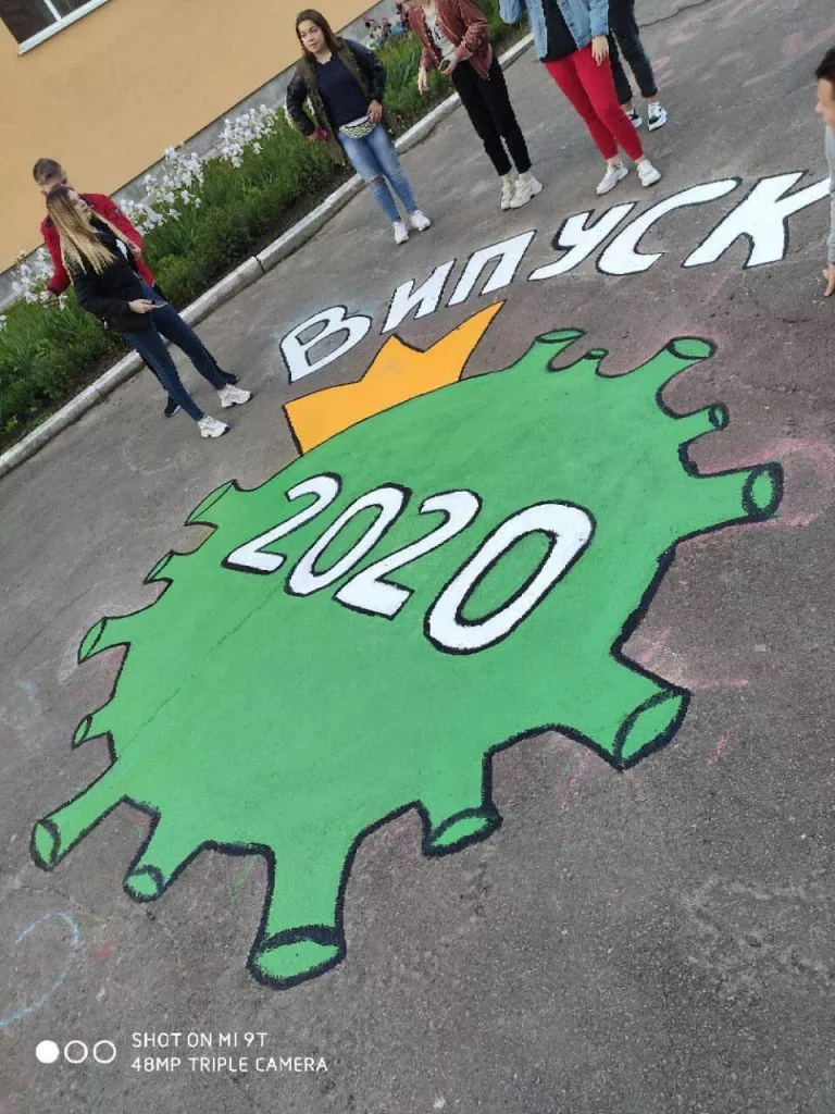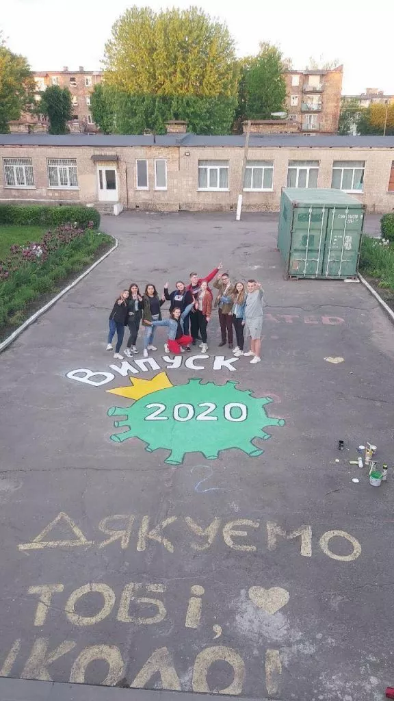Випускники нововолинської школи №2 на згадку про особливий період навчання, який пов’язаний з карантином та пандемією коронавірусу, намалювали на подвір’ї навчального закладу символічний малюнок.