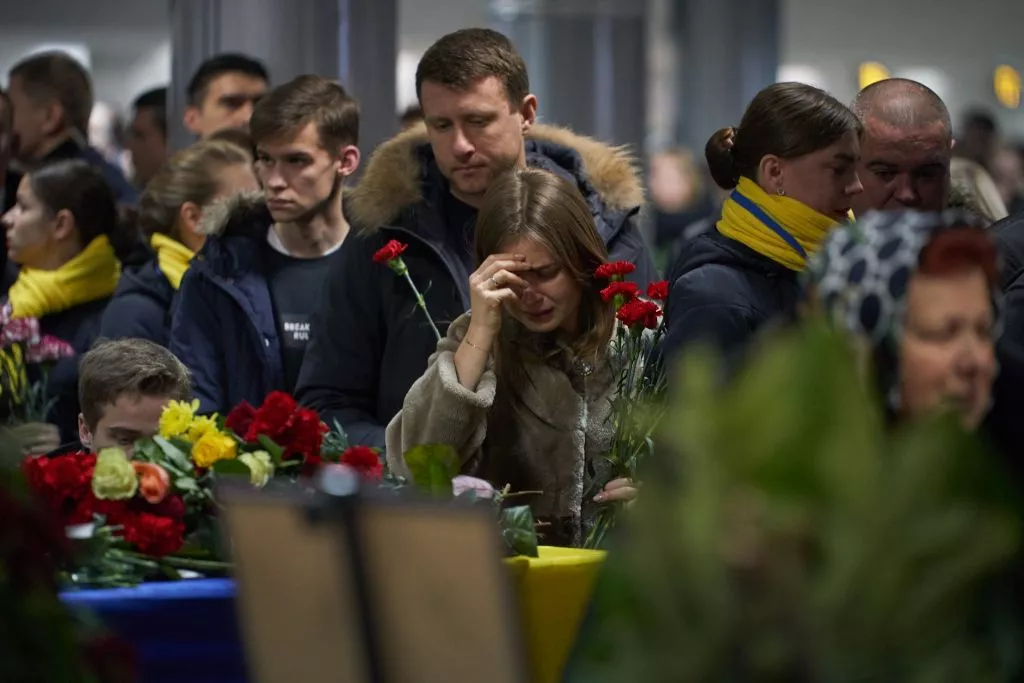 У Борисполі під жалобну музику солдати у парадній формі віднесли закриті труни з прапором України від літака до машин. Далі їх перевозили до терміналу В, – пише Газета.