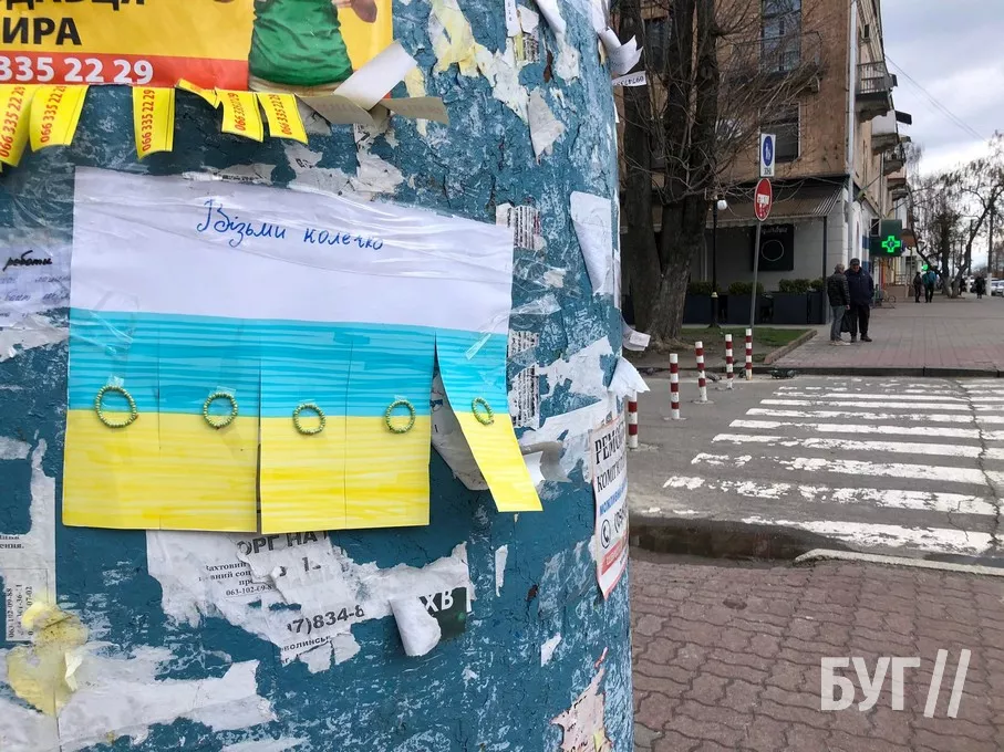 6-го квітня нововолинці розвішали на дошках оголошень патріотичні листівки, що підіймають настрій мешканцям та гостям міста. На листівках синьо-жовтого кольору розташований напис «Візьми колечко» та приклеєна власноруч зроблена прикраса з бісеру. Судячи за почерком – це дитина, яка вирішила подарувати нововолинцям трішки позитиву та добра.