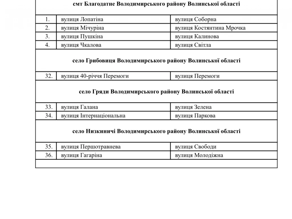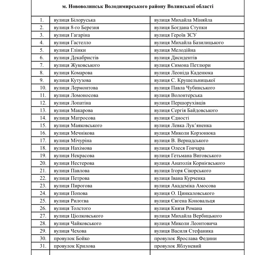 Рішення про перейменування прийняли на сесії Нововолинської міськради 3-го листопада. 31 назву вулиць змінили у Нововолинську, 4 – у Благодатному, по 2 – у Грядах та Низкиничах та одну – в Грибовиці. Декілька вулиць після громадських обговорень залишили зі старими назвами: проспект Дружби, який хотіли перейменувати у проспект Європейський, вулиці Гоголя, Філатова та Партизанська.