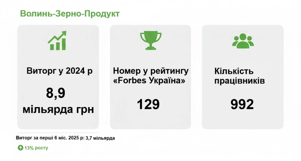 На 129-му місці рейтингу – «Волинь-Зерно-Продукт» (у 2024-му № 135). Компанія виторгувала за 2024-й 8,9 мільярда гривень і отримала понад 200 мільйонів гривень прибутку. За 6 місяців 2025-го року – виторг зріс на 13% до 3,7 мільярда гривень. На агропідприємстві – 992 працівники.