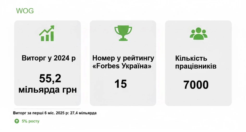 Найвище серед волинських підприємств у рейтингу, на 15 місці, – WOG. Яке саме підприємство, чи групу цієї торгової марки мають на увазі упорядники цього списку, важко сказати, адже за даними видання, компанія виторгувала за 2024 рік 55,2 мільярда гривень. За шість місяців цього року виторг зріс на 5% і склав 27,4 мільярда гривень. А також WOG працевлаштувала 7 тисяч людей.