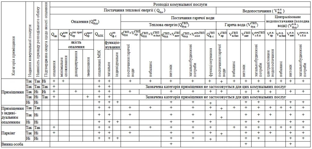 1. Знаком “+” позначені складові комунальної послуги, які розподіляються між зазначеними категоріями приміщень, без умовних позначень – не розподіляються.