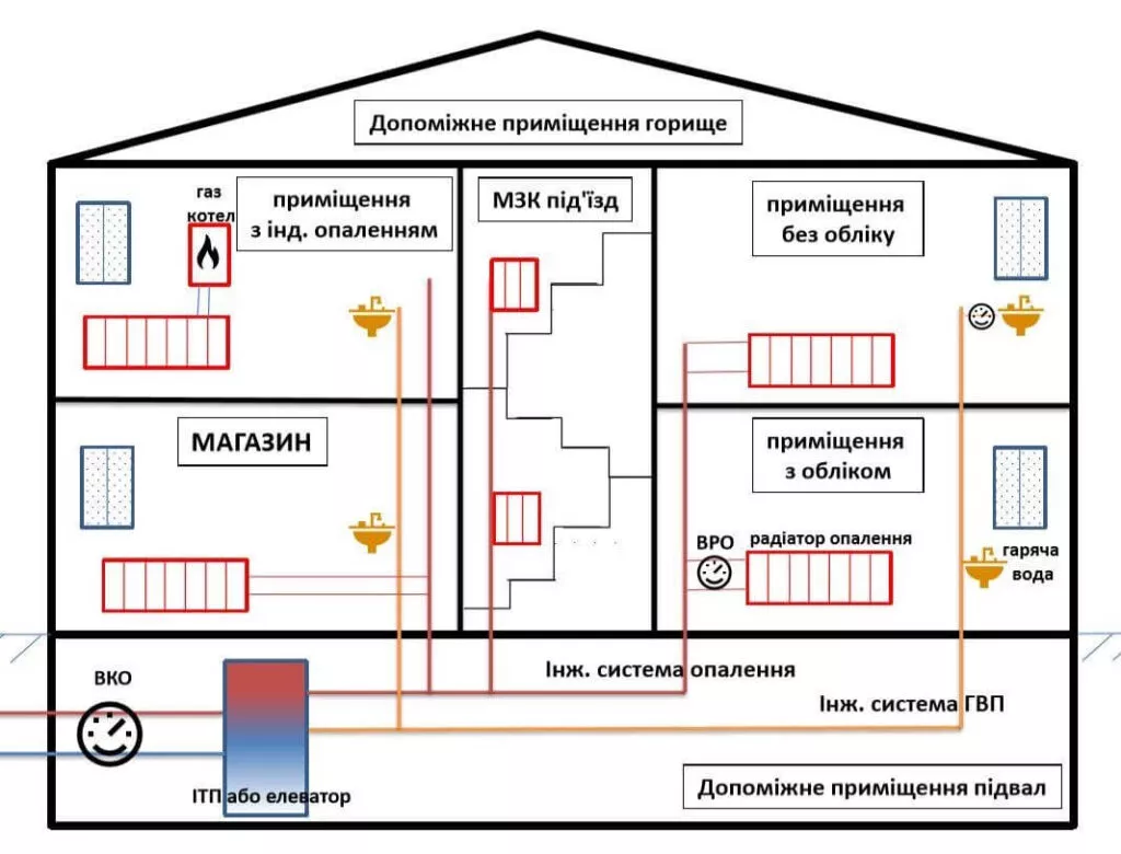 Звертаємо увагу споживачів, що комерційний прилад обліку теплової енергії обліковує ВСЮ теплову енергію, витрачену у будівлі, а не лише на опалення квартир, які не відокремлені від системи теплопостачання. Тому справедливо, що кожне приміщення оплачує свою частку. Дві складові оплачують ВСІ співвласники будівлі – це обсяг теплової енергії, витрачений на опалення МЗК та функціонування системи. Далі неопалювані квартири або квартири з індивідуальним опаленням оплачують за втрачену теплову енергію в транзитних трубопроводах в їх квартирах. Залишок теплової енергії розподіляється на квартири з централізованим теплопостачанням.