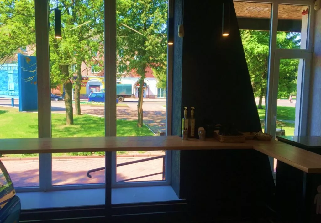 Смачно перекусити можна відразу в магазині, для цього розміщена дерев’яна стільниця поруч з вікном, з якого відкривається чудовий вигляд на парк та центральну частину міста.