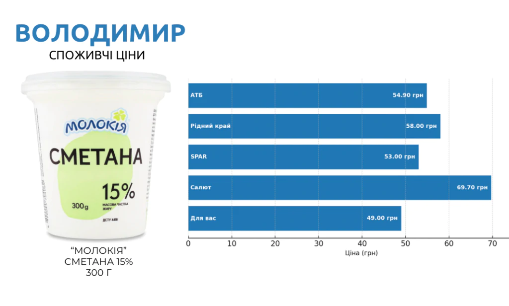 Журналісти БУГу провели власний моніторинг цін на популярний молочний продукт — сметану «Молокія» 15% жирності — у п’яти торгових точках Нововолинська. В магазинах вона представлена і в склянках, і у пакетованому вигляді. Різниця в ціні — понад 20 гривень.