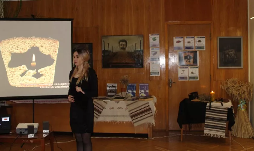 До присутніх звернулась зі зворушливою промовою про голодомор директорка міського історичного музею, ведуча заходу Ірина Костюк та продемонструвала присутнім кадри документального фільму про страшні роки лихоліття.