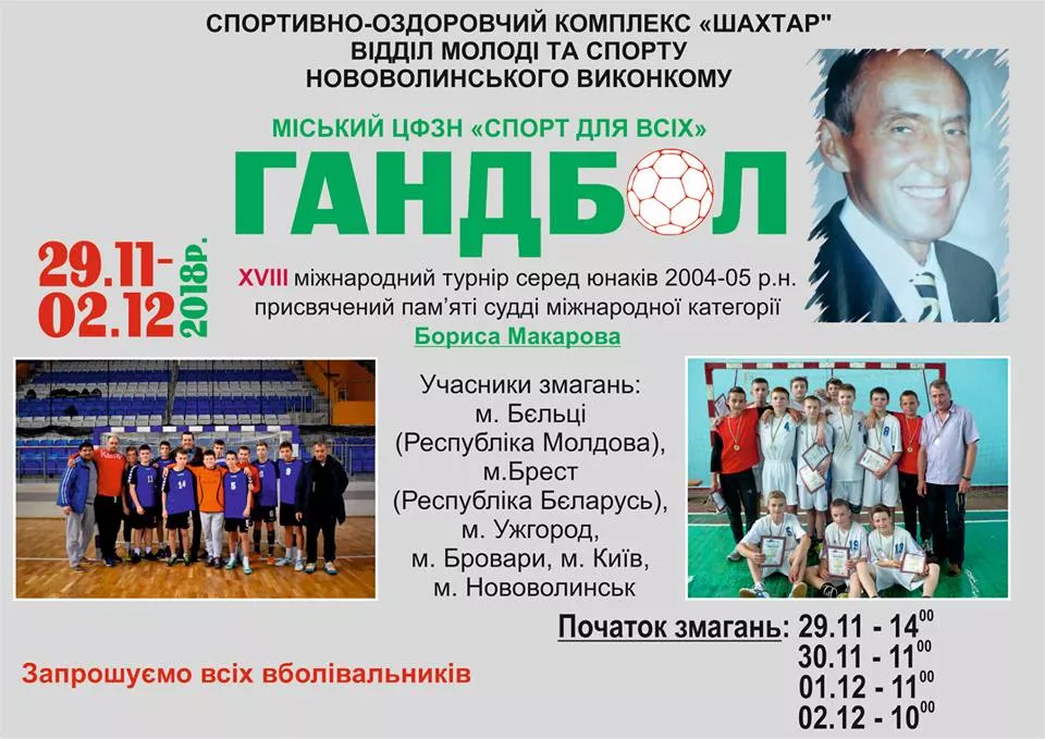 У Нововолинську 29 листопада – 2 грудня пройде Міжнародний турнір по гандболу серед юнаків 2004-2005 року народження, присвячений пам’яті судді міжнародної категорії Бориса Макарова.
