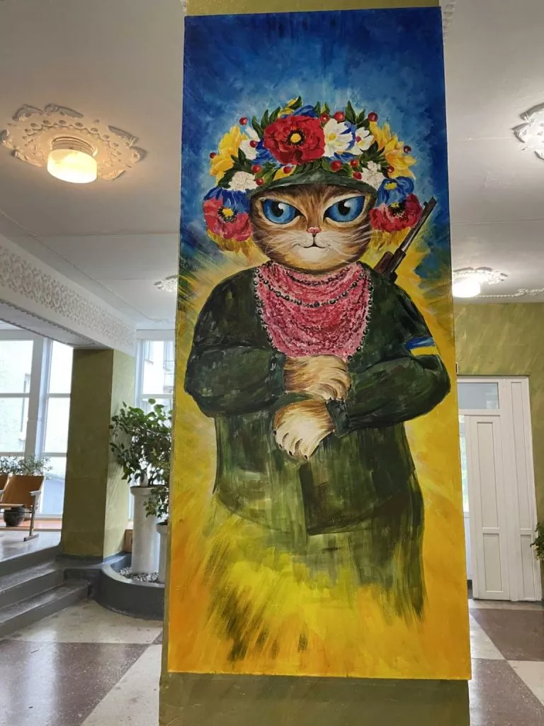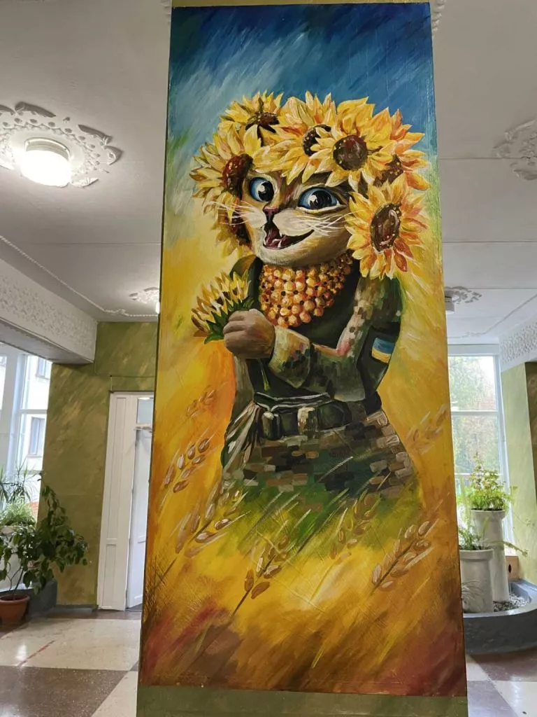 Фоє НЦ ДЮЦ розмалювали патріотичними роботами вихованців закладу. У приміщенні розмістили три репродукції картин львівської художниці Маріанни Пащук із зображеними котиками-воїнами.