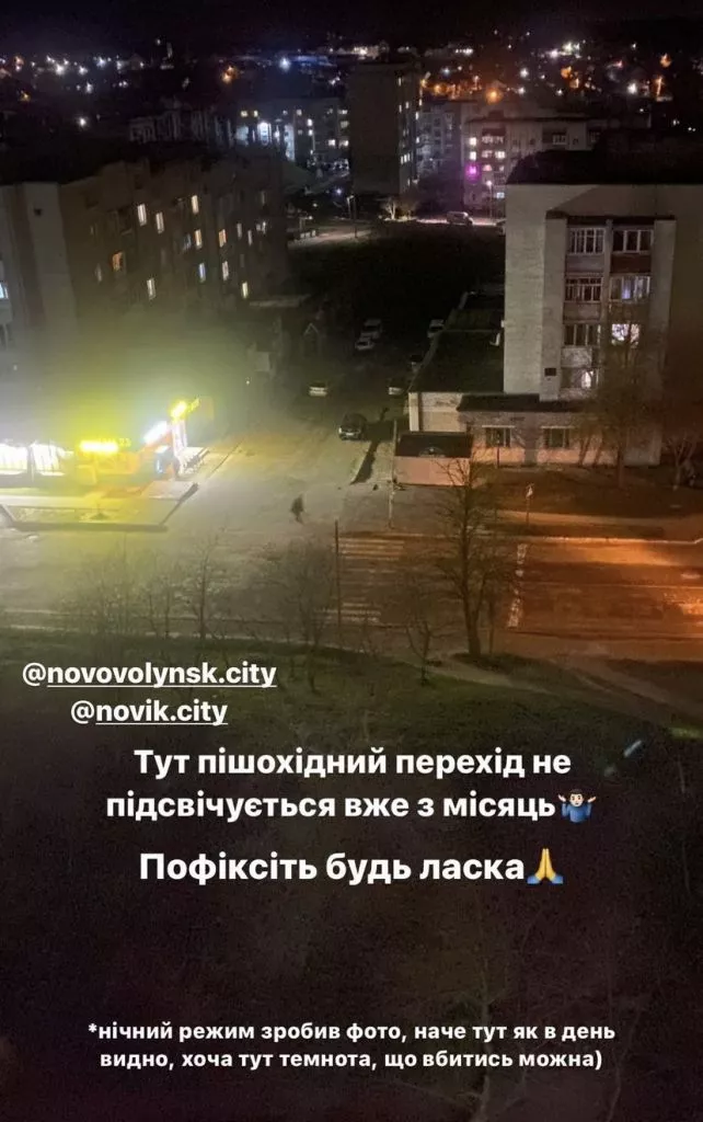 У мережі інстаграм нововолинці звернулись до активу міста з проханням вирішити дане питання, аби водії мали змогу помітити пішохідний перехід в темну пору доби.
