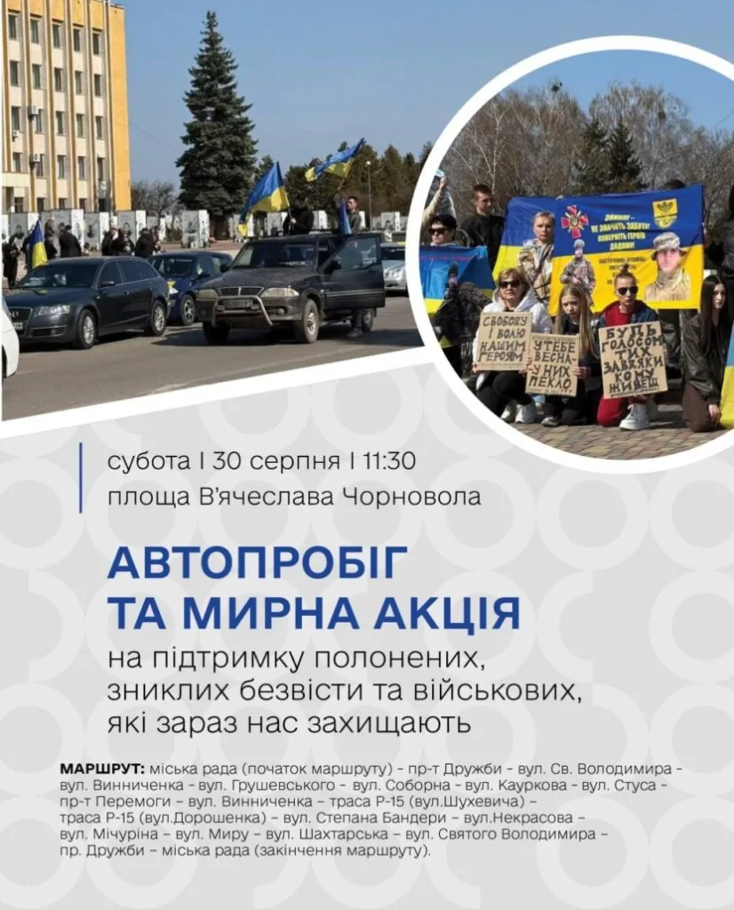 30-го серпня з 12:00 до 14:00 у Нововолинську проведуть автопробіг та мирну акцію на підтримку полонених, зниклих безвісти Захисників та воїнів, які сьогодні боронять Україну.