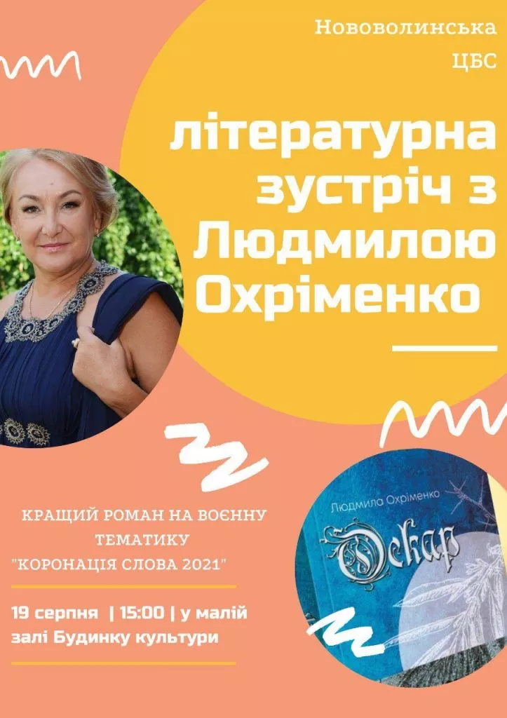 19-го серпня о 15:00 в малій залі міського палацу культури відбудеться зустріч з Людмилою Охріменко. Її роман «Оскар» отримав відзнаку на Міжнародному літературному конкурсі «Коронації слова – 2021» як найкращий роман на воєнну тематику.