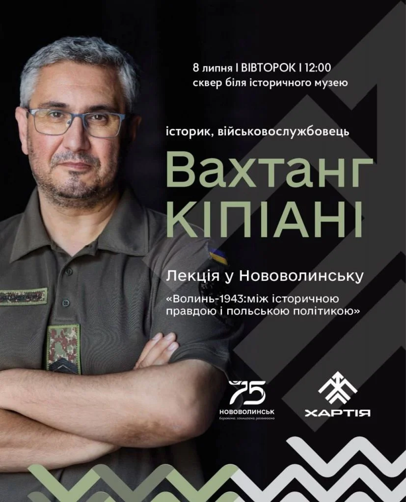 8 липня о 12:00 у сквері біля історичного музею (пр-т Дружби, 27) відбудеться публічна лекція історика, військовослужбовця Вахтанга Кіпіані. Тема: «Волинь-1943: між історичною правдою і польською політикою».