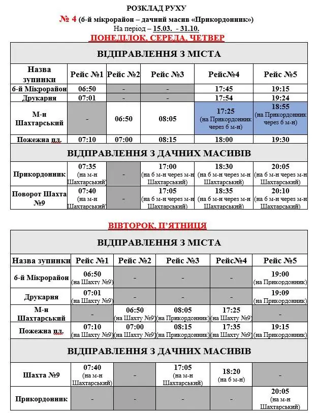 Зверніть увагу, що окремі рейси виконуються до дачного масиву «Прикордонник», а окремі – до масиву Шахти №9, тому пасажирам рекомендують ознайомитися з повним розкладом.