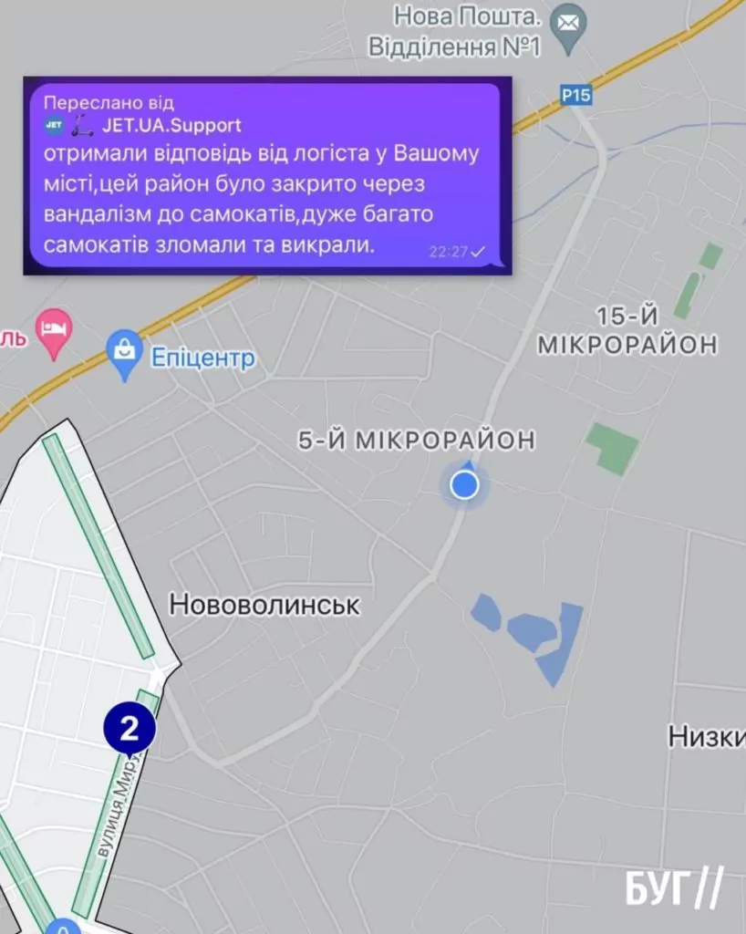 Як розповів власник електросамокатів в коментарі БУГу, на 15-му мікрорайоні їх постійно псували, викидали в корчі, виривали ліхтарі та сунули в болото. Через значне пошкодження двоколісних транспортних засобів, локацію довелось закрити.