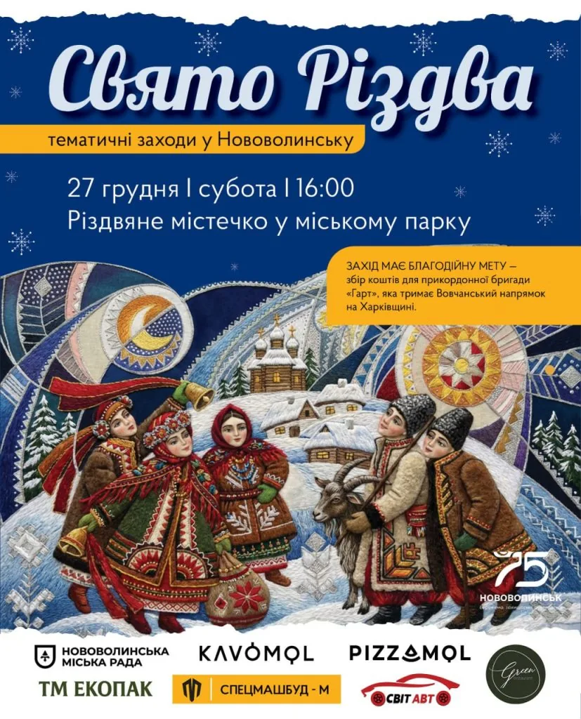 У суботу, 27-го грудня, Нововолинськ знову наповниться різдвяною атмосферою. У міському парку, на локації Різдвяного містечка, для мешканців і гостей громади підготували насичену святкову програму, що поєднує традиції, теплі емоції та благодійну мету.