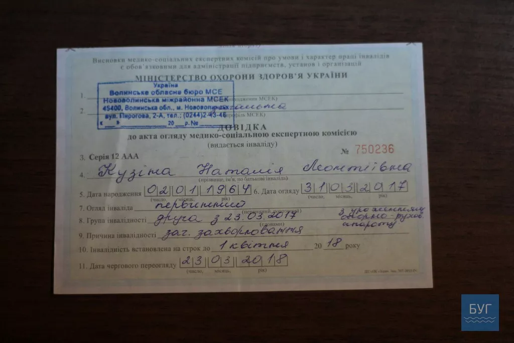 Мешканка Нововолинська Наталія Кузіна вже 4 місяці не може отримати пенсію по інвалідності. Весь цей час жінка живе за гроші, які позичає в сусідки та знайомих. Перепоною для отримання фінансової допомоги є те, що Наталія Леонтіївна офіційно не розлучена з чоловіком, з яким не проживає вже понад 20 років.