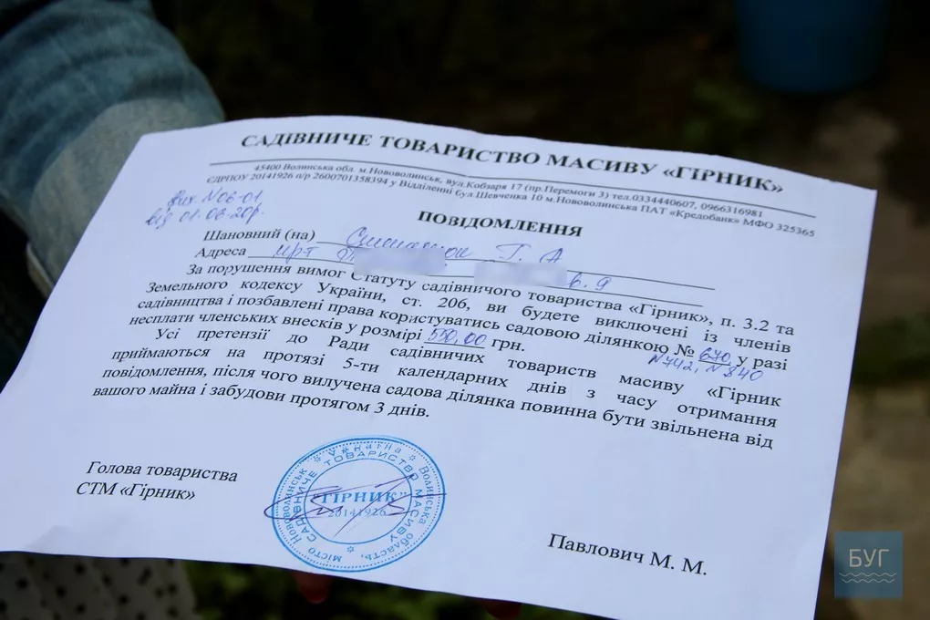 Я маю на п’ятій дачу і регулярно плачу. Чому інші не платять? Інформація про бюджет товариства ,я так думаю, не є секретом,коли платить 20 процентів то про які смітники може бути мова. Я цікавився в керівництва і вони праві, будинки на території масиву не є об’єктами нерухомості і земля належить товариству то такі халявщики є прямою загрозою функціонування дачного масиву. Якщо садовод так називаються члени товариства не може оплатити в місяць членський внесок у розмірі вартості пів кілограма помідорів то який він садовод. Нехай забирає або продає своє майно що знаходиться на ділянці. А коли садоводи порушуючи закон зводять будинки з фундаментом, не платять по п’ять років це їхні проблеми. На рахунок сміття я як людина що прожила не мало років у селі хочу для себе зрозуміти де береться сміття у лісі, чи у садку. Якщо ви принесли пластиковий пакет чи пляшку води, або коробку цигарок то тару з них назад набагато легше нести до дому ніж на дачу. Листя та гілки це безкоштовний компост(добриво). Ще довго совок треба викорінювати з голови громадян, а як правило саме з тих хто з заводу або фабрики не крав, а ніс. Халява закінчилась, організуйте мітинг щоб невідключали світло боржникам, а за них сплачували ті що платять постійно. прийде половина міста. А журналістам раджу коли даєте такі фото документів то нелінуйтесь подивитись на дати та зміст.