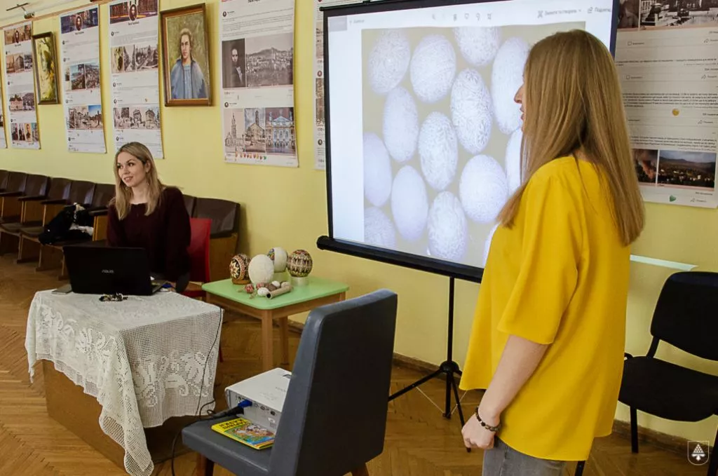 На початку заняття Марія Булюк розповіла про мистецтво писанкарства, матеріали, необхідні для роботи, техніки виготовлення писанок, орнаменти, які традиційно використовують у писанкарстві.