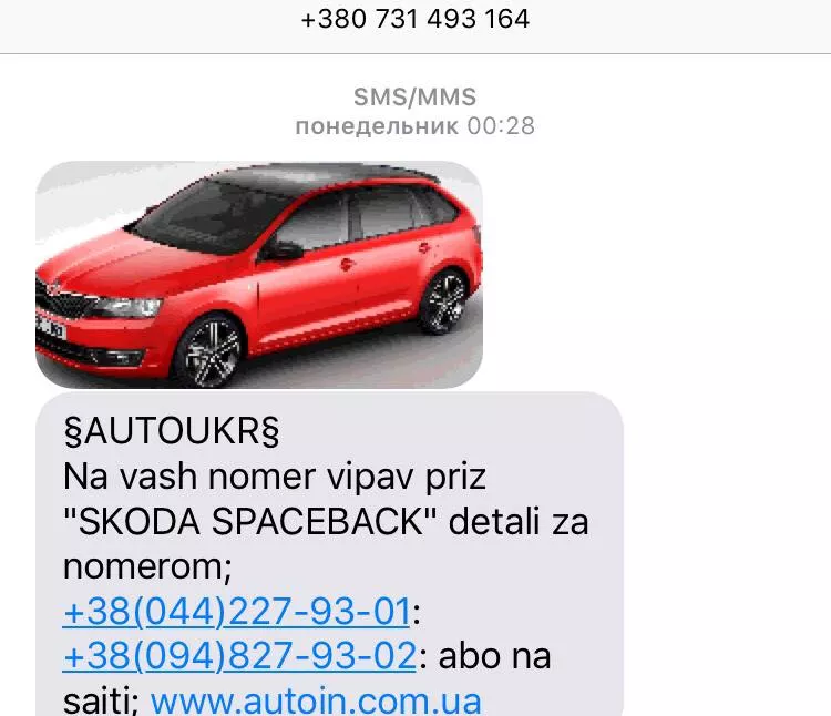 На мобільний телефон прийшло повідомлення “На ваш номер випав приз – автомобіль”. За більш детальною інформацією потрібно було звернутися за вказаним у повідомленні номером. Коли “щаслива власниця” зателефонувала, співрозмовник, який відрекомендувався представником компанії, що проводить розіграш, повідомив про деякі умови, за яких можна отримати автомобіль – комісійні за послуги транспортування і страхування.